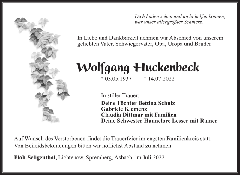 Hier finden Sie alle Traueranzeigen aus der Zeitung, die bisher für Wolfgang Huckenbeck erschienen sind. Weitere Traueranzeigen, die in der Zeitung erscheinen, werden hier ebenfalls aufgelistet