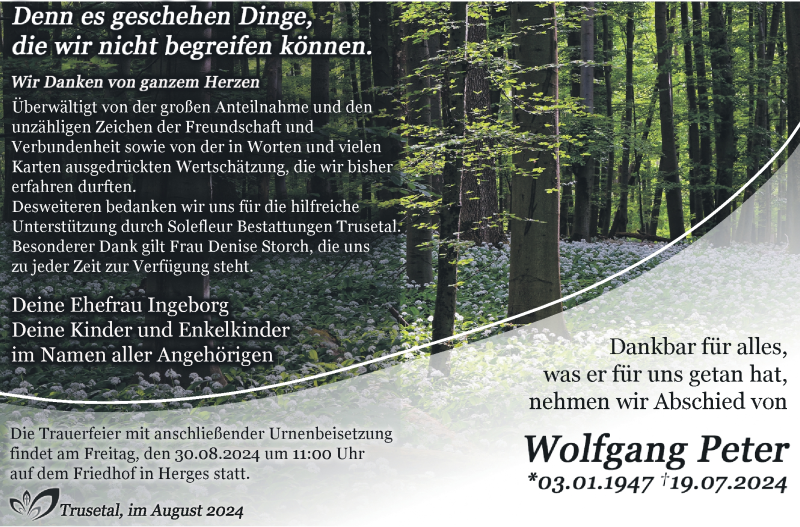 Hier finden Sie alle Traueranzeigen aus der Zeitung, die bisher für Wolfgang Peter erschienen sind. Weitere Traueranzeigen, die in der Zeitung erscheinen, werden hier ebenfalls aufgelistet