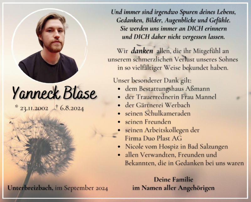 Hier finden Sie alle Traueranzeigen aus der Zeitung, die bisher für Yanneck Blase erschienen sind. Weitere Traueranzeigen, die in der Zeitung erscheinen, werden hier ebenfalls aufgelistet